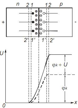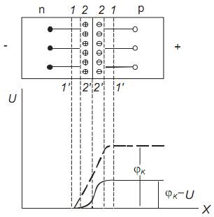 Если внешнее напряжение приложено плюсом к n-области, а минусом к – p-области, то оно совпадает по знаку с контактной разностью потенциалов.