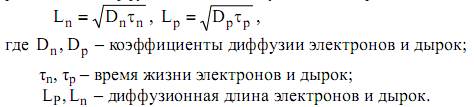 носителей. Значение тока экстракции определяется числом неосновных носителей заряда, возникающих в полупроводнике в единицу времени на расстоянии, которое они могут пройти за время жизни. Это расстояние называется диффузионной длиной электронов и дырок. Концентрация неосновных носителей на расстоянии диффузионной длины убывает в е раз.