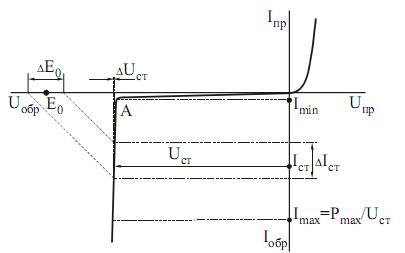 Для работы используется обратная ветвь, где значительному изменению тока соответствует малое изменение напряжения. Точка А соответствует устойчивому пробою и определяет величину минимального тока Imin. После точки А ток резко возрастает и допустимая величина его Imax ограничивается лишь мощностью рассеяния P max: