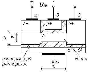 – удельное сопротивление полупроводника; l, w – длина и ширина канала соответственно, h – расстояние между металлургическими границами n-слоя. Чем больше обратное напряжение на затворе Uзи, тем шире p-n-переходы и тоньше канал. При некотором напряжении затвора канал полностью перекрывается. Это напряжение называется напряжением отсечки Uзи отс.