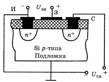 В основе действия МДП-транзистора лежит эффект поля, представляющий собой изменение величины и типа электропроводности полупроводника вблизи его границы с диэлектриком под действием приложенного напряжения. Если к затвору приложить отрицательное напряжение, то дырки будут притягиваться к диэлектрику SiO2 и на поверхности полупроводника образуется слой с высокой их концентрацией. Такой режим называется режимом обогащения канала. При подаче на затвор положительного напряжения дырки выталкиваются от поверхности полупроводника и образуется слой с уменьшенной концентраций дырок. Такой режим называется режимом обеднения. Электроны из полупроводника p-типа будут притягиваться к диэлектрику, и у поверхности полупроводника р-типа образуется слой с электропроводностью n-типа. Таким образом, между истоком и стоком образуется область n+-n-n+ типа. Такой режим называется инверсией электропроводности. Изменяя напряжения на затворе, можно изменять сопротивление канала.