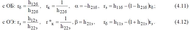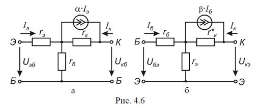 Физическая Т-образная эквивалентная схема БТ наряду с h-параметрами также достаточно полно отражает свойства реального транзистора на низких частотах и широко используется для анализа малосигнальных транзисторных усилителей. Физические Т-образные эквивалентные схемы БТ с ОБ и ОЭ представлены на рис. 4.6, а, б соответственно. Значения параметров эквивалентных схем БТ могут быть найдены с использованием известных h-параметров для включения БТ: