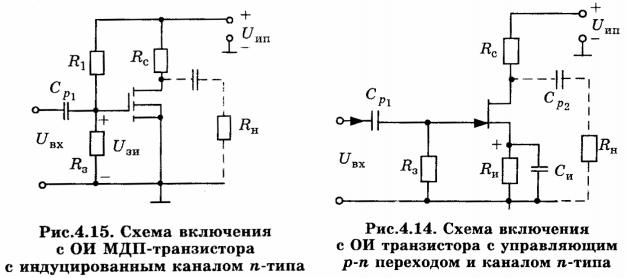 Полевые транзисторы с индуцированным каналом, у которых стоковое напряжение и напряжение на затворе имеют одинаковую полярность, смещение на затвор подается обычно с помощью делителя напряжений R1 и R3(рис. 4.15).