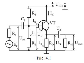 На практике питание схем осуществляется от одного общего источника напряжения. При подаче питания на полевые транзисторы с управляющим p–n переходом, для которых стоковое напряжение и напряжение на затворе должны быть разного знака, необходимое напряжение на затворе может быть создано с помощью цепочки автоматического смещения RиCи, включенной в цепь истока (рис. 4.14).