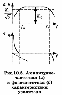 Зависимость коэффициента усиления от частоты входного сигнала К=F(f) принято называть амплитудно-частотной (частотной) характеристикой (АЧХ) рис. 10.5,а.