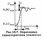 Переходная характеристика выражает зависимость от времени выходного напряжения усилителя, на вход которого подан мгновенный скачок напряжения (рис. 10.7).