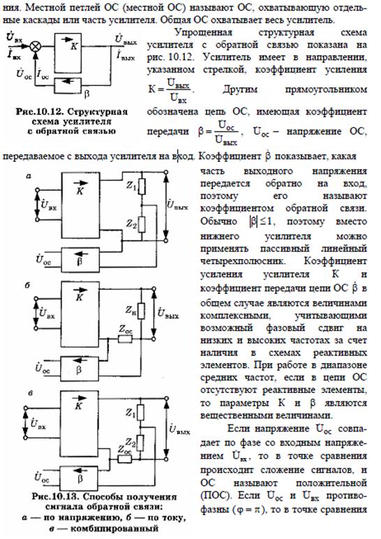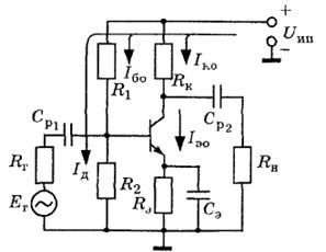 Принципиальная схема усилительного резисторного каскада с ОЭ представлена на рис. 10.22. Входной сигнал поступает на базу транзистора от генератора напряжения с внутренним сопротивлением Rr. Разделительный конденсатор Ср1 служит для предотвращения протекания постоянной составляющей тока базы через источник входного сигнала. При отсутствии Ср1 в цепи источника входного сигналавходного сигнала создавался бы постоянный питания Uип который мог бы вызвать падение напряжения на внутреннем сопротивлении Rг источника сигнала, изменяющее режим работы транзистора и приводящее к нагреву источника сигнала. Конденсатор Сp2 на выходе усилительного каскада обеспечивает выделение переменной составляющей коллекторного напряжения, которая поступает на нагрузочное устройство с сопротивлением Rn. Элементы R1, R3, Rэ обеспечивают режим каскада по постоянному току и температурную стабилизацию.