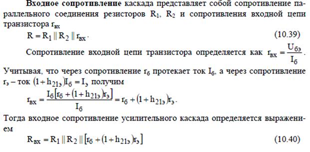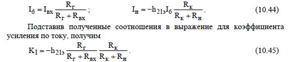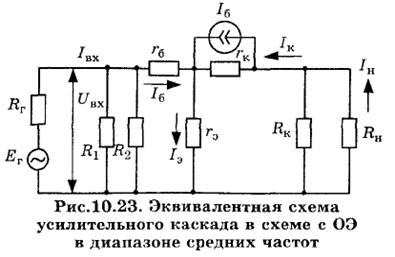 Параметры усилителя (коэффициенты усиления по току KI, напряжению KU и мощности Kp ρ; входное Rвх и выходное Rвых сопротивления) находятся с использованием аналитического метода, при котором на основе малосигнальной эквивалентной схемы транзистора строится эквивалентное представление каскада по переменному току и проводится его расчет по переменному току (рис. 10.23).