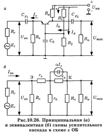 Усилительный каскад на биполярном транзисторе, включенном по схеме с общей базой, может использовать один или два источника питания. Рассмотрим каскад с ОБ с одним источником питания, принципиальная схема которого приведена на рис. 10.26, а. В этом каскаде для создания оптимального тока базы в режиме покоя 1бо, обеспечивающего работу усилительного каскада на линейном участке входной характеристики, служат резисторы R1 и R2. Конденсатор Сб имеет в полосе пропускания усилителя сопротивление значительно меньше R2, и падение напряжения на нем от переменной составляющей тока мало, поэтому можно считать, что по переменной составляющей тока база соединена с общей точкой усилительного каскада. Входное напряжение подается между эмиттером и базой через разделительный конденсатор Ср1. Выходное напряжение снимается между коллектором и базой через разделительный конденсатор Ср2. Резистор Rэ служит для прохождения постоянной составляющей тока эмиттера и для того, чтобы Rэ не шунтировало входное сопротивление каскада, оно на два-три порядка выше этого сопротивления каскада.