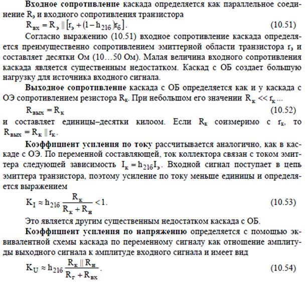 Анализ работы усилительного каскада с общей базой по входным и выходным характеристикам проводится аналогично анализу работы каскада с ОЭ. Выходные характеристики транзистора в схеме с ОБ более линейны, чем в схеме с ОЭ, поэтому нелинейные искажения в этом случае меньше. Расчет параметров усилительного каскада с ОБ по переменному сигналу в области средних частот проводится по эквивалентной схеме, представленной на рис1О.26, б. На ней не показаны разделительные конденсаторы Ср1, Ср2 и конденсатор Сб, с помощью которого заземляется база транзистора по переменному току, так как их номиналы выбраны такими, что емкостные сопротивления даже в области низких частот невелики и при анализе их можно не учитывать.