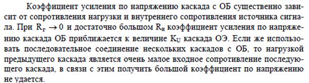 При подаче на вход рассматриваемого каскада положительной полуволны входного сигнала ток эмиттера и ток коллектора будут уменьшаться. Это приводит к уменьшению падения напряжения на Rк и увеличению Uкб, что приводит к формированию положительной полуволны выходного напряжения Uвых. Полярности входного и выходного напряжений совпадают, схема не инвертирует входной сигнал. Анализ работы усилительного каскада с общей базой по входным и выходным характеристикам проводится аналогично анализу работы каскада с ОЭ. Выходные характеристики транзистора в схеме с ОБ более линейны, чем в схеме с ОЭ, поэтому нелинейные искажения в каскаде с ОБ меньше, чем в каскаде с ОЭ.
