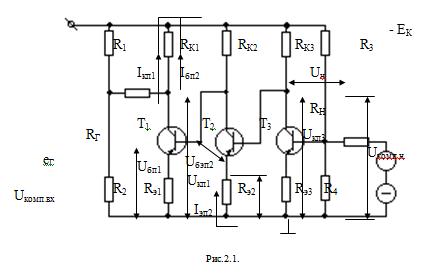 Во входную цепь усилителя (рис.2.1) последовательно с источником входного сигнала включен источник входного компенсирующего напряженияUкомп.вх. его вводят для того, чтобы при eг = 0 напряжение Uбп1 соответствовало требуемому значению напряжения в режиме покоя и ток через источник был равен нулю. С этой целью компенсирующее напряжение выбирают равным Uбп1.