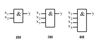 Логический элемент И выполняет операцию логического умножения (конъюнкция) над своими входными данными и имеет от 2 до 8 входов и один выход (как правило, выпускаются элементы с двумя, тремя, четырьмя и восемью входами). На рис. 1. изображены условные графические обозначения (УГО) логических элементов И с двумя, тремя и четырьмя входами соответственно. Элементы И обозначаются как NИ, где N - количество входов логического элемента (например, 2И, 3И, 8И и т.д.).