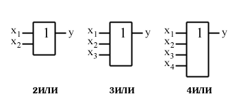 Логический элемент ИЛИ выполняет операцию логического сложения (дизъюнкция) над своими входными данными и, также как и логический элемент И, имеет от 2 до 8 входов и один выход. На рис. 2. изображены УГО логических элементов ИЛИ с двумя, тремя и четырьмя входами соответственно. Элементы ИЛИ обозначаются также, как и элементы И (2ИЛИ, 4ИЛИ и т.д.).