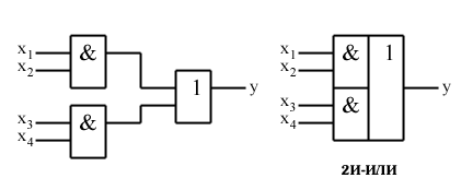 Существуют и более сложные логические элементы, выполняющие несколько логических операций над своими входными данными. Например, элемент 2И-ИЛИ, УГО и схема которого приведено на рис., сначала выполняет операцию логического умножения над парами операндов x1, x2 и x3, x4, а затем выполняет операцию логического сложения над полученными результатами, т.е. y = x1x2 + x3x4.