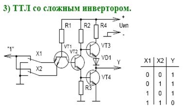 Если хотя бы на одном из входов будет действовать логический ноль, соответствующий эмиттерный переход будет открыт. В цепи коллектора, а следовательно, и в цепи базы ток будет отсутствовать, будет находиться в режиме отсечки, ток через транзистор, а значит, ток базы будут близки к нулю. Транзистор также будет находиться в режиме отсечки, и на выходе будет высокий уровень напряжения логической единицы. При этом напряжение на коллекторе и на базе будет максимальным, и будет находиться в полностью открытом состоянии.При подаче на оба входа логических единиц оба эмиттерных перехода закрываются, и ток будет протекать по цепи от плюса, через R1, переход база-коллектор на базу. Транзистор VT2 перейдёт в режим насыщения. Ток через него, а следовательно, и ток базы будет максимальным, и транзистор VT4 перейдёт в режим насыщения. На выходе будет низкий уровень логического нуля. При этом напряжение на коллекторе VT2 и на базе будет близко к нулю и перейдёт в полностью закрытое состояние. Диод VD1 применяется для более надёжного запирания транзистора VT3