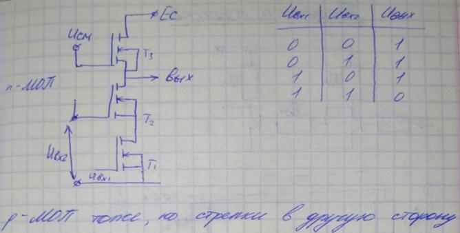 Рассмотрим КМОП-схему с двумя входами, в которой входные сигналы поступают на р-МОП, соединенные последовательно, и на n-МОП, соединенные параллельно