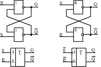 Основу триггеров составляют простейшие запоминающие ячейки, представляющие собой симметричную структуру из двух логических элементов ИЛИ-НЕ либо И-НЕ, охваченных перекрёстной обратной связью: