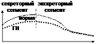 3) изотопная ренография – в/в вводится гиппуран, меченый йодом, который избирательно накапливается в почках и выводится только через них, затем ставится 2 датчика на поясницу и 1 – на область сердца; кривая состоит из двух отрезков: секреторный сегмент говорит о работе клубочков и их способности захватывать из крови гиппуран, экскреторный – о работе канальцев и собирательных трубочек; при ГН снижена почечная секреция, поэтому первый отрезок расположен ниже нормы.