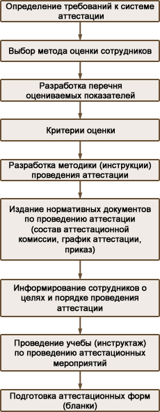 Этап 1. Подготовка к проведению аттестации заключается в разработке аттестационной модели, нормативных и методических материалов по проведению аттестационных мероприятий и информированию сотрудников.