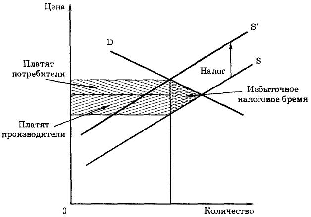 Сумма налогового бремени распределяется между потребителями и производителями, а так же включает избыточное налоговое бремя (потери общества). Если спрос эластичен