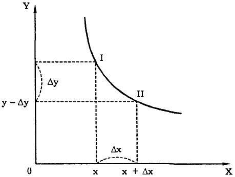 Предельная норма замещения - количество, на которое потребление одного из двух благ должно быть увеличено (или уменьшено), чтобы целиком возместить потребителю уменьшение (или увеличение) потребления другого блага на одну дополнительную (предельную) единицу. При движении от точки 1 к точке 2 предельная норма замещения возрастает