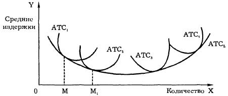 В случае возрастающей производительности средние общие издержки уменьшаются, а при убывающей производительности растут, соединив точки минимума средних общих издержек, мы получим средние совокупные издержки.