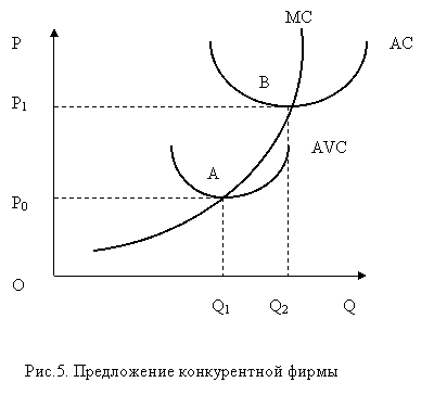 Если рыночная цена продукта меньше Р1, то фирма прекращает производство, а ее предложение равно нулю. Если рыночная цена продукта лежит в пределах от Р1 до Р2, то фирма продолжает производство, но несет убытки. Если цена продукта больше Р2, то фирма получает прибыль.