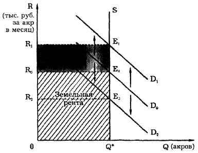 Изменение спроса на основной продукт питания повысит ежемесячную ренту за один акр земли с R0 до. R1. Это приведет к увеличению чистой экономической ренты до площади 0Q* E1 R1. В случае падения спроса ежемесячная рента за акр земли уменьшится до R2 и абсолютная рента сократится до 0Q* E2 R2.