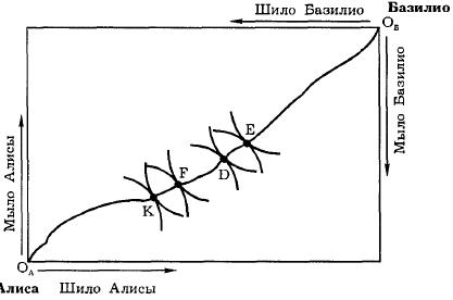 K, F, D, У – паретно-эффективны. Каждая точка на кривой контрактов является высшей не абсолютно, а относительно: только по отношению к точкам, лежащим вне кривой контрактов. Движение в направлении кривой контрактов повышает общее благосостояние, в то время как движение вдоль кривой контрактов лишь перераспределяет общее благосостояние между участниками сделки.