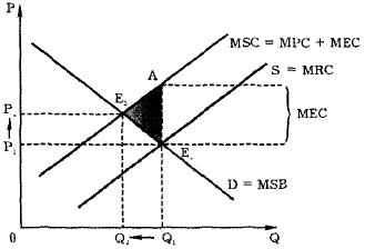 При наличие отрицательного внешнего эффекта экономическое благо продается и покупается в большем по сравнению с эффективном объеме, т.е. имеет место перепроизводство товаров и услуг с отрицательными внешними эффектами.