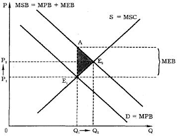 При наличие положительного внешнего эффекта экономическое благо продается и покупается в меньшей по сравнению с эффективным объеме, т.е имеет место недопроизводство товаров и услуг с положительным внешнем эффектами.