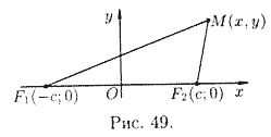 Обозначим фокусы через F1 и F2, расстояние между ними через 2 c, а сумму расстояний от произвольной точки эллипса до фокусов — через 2 a (см. рис. 49). По определению 2 a > 2 c, т. е. a > c.