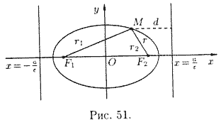 Пусть М(х;у) -- произвольная точка эллипса с фокусами F1 и F2 (см. рис. 51). Длины отрезков F1M=r1 и F2M = r2 называются фокальными радиусами точки Μ. Очевидно,