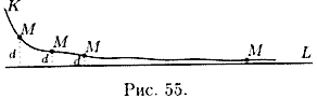 неограниченной кривой K, если расстояние d от точки M кривой K до этой прямой стремится к нулю при неограниченном удалении точки M вдоль кривой K от начала координат. На рисунке 55 приведена иллюстрация понятия асимптоты: прямая L является асимптотой для кривой К.
