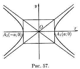 При построении гиперболы (11.9) целесообразно сначала построить основной прямоугольник гиперболы (см. рис. 57), провести прямые, проходящие через противоположные вершины этого прямоугольника, — асимптоты гиперболы и отметить вершины