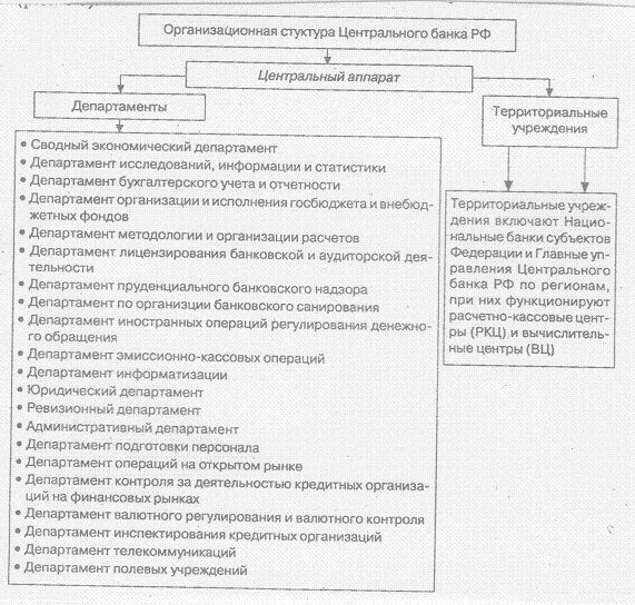 Центральный банк Российской Федерации осуществляет эмиссию денег, регулирование наличного и безналичного обращения, изъятие денег из обращения. Банк России является органом денежно-кредитного регулирования, в рамках которого определяет учетные ставки по кредитам, нормы обязательных резервов, осуществляет операции на открытом рынке. Центральный банк РФ выполняет функции депозитария и фискального агента Правительства России по кассовому исполнению бюджета и обслуживанию государственного долга России. Он занимается операциями по размещению государственных займов, их погашению и выплате процентов.