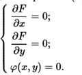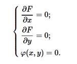 Достаточным условием, из которого можно выяснить характер экстремума, служит знак d 2 F = F ′′ xxdx 2+2 F ′′ xydxdy + F ′′ yydy 2. Если в стационарной точке d 2 F >0, то функция z = f (x, y) имеет в данной точке условный минимум, если же d 2 F <0, то условный максимум. Примечание (желательное для более полного понимания текста): показать\скрыть Есть и другой способ для определения характера экстремума. Из уравнения связи получаем: φ ′ xdx + φ ′ ydy =0, dy =− φ ′ xφ ′ ydx, поэтому в любой стационарной точке имеем: d 2 F = F ′′ xxdx 2+2 F ′′ xydxdy + F ′′ yydy 2= F ′′ xxdx 2+2 F ′′ xydx (− φ ′ xφ ′ ydx)+ F ′′ yy (− φ ′ xφ ′ ydx)2==− dx 2(φ ′ y)2⋅(−(φ ′ y)2 F ′′ xx +2 φ ′ xφ ′ yF ′′ xy −(φ ′ x)2 F ′′ yy) Второй сомножитель (расположенный в скобке) можно представить в такой форме: