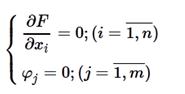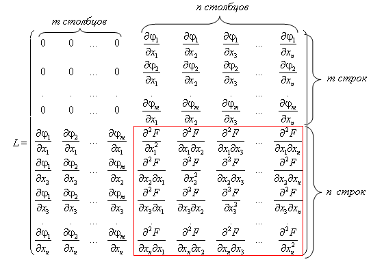 Необходимые условия наличия условного экстремума задаются системой уравнений, из которой находятся координаты стационарных точек и значения множителей Лагранжа: Выяснить, условный минимум или условный максимум имеет функция в найденной точке, можно, как и ранее, посредством знака d 2 F. Если в найденной точке d 2 F >0, то функция имеет условный минимум, если же d 2 F <0, – то условный максимум. Можно пойти иным путем, рассмотрев следующую матрицу:
