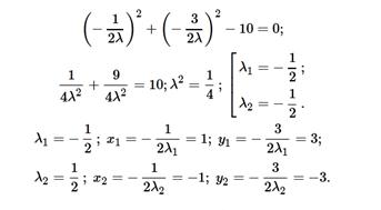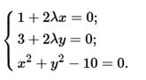 Запишем систему уравнений для определения стационарных точек функции Лагранжа: Если предположить λ =0, то первое уравнение станет таким: 1=0. Полученное противоречие говорит о том, что λ ≠0. При условии λ ≠0 из первого и второго уравнений имеем: x =−12 λ, y =−32 λ. Подставляя полученные значения в третье уравнение, получим:
