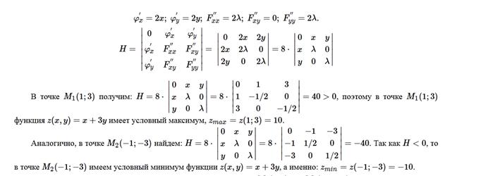 Итак, система имеет два решения: x 1=1; y 1=3; λ 1=−12 и x 2=−1; y 2=−3; λ 2=12. Выясним характер экстремума в каждой стационарной точке: M 1(1;3) и M 2(−1;−3). Для этого вычислим определитель H в каждой из точек.