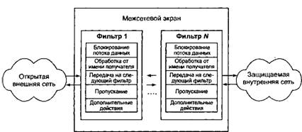 Фильтрация трафика. Фильтрация информационных потоков состоит в их выборочном пропускании через экран, возможно, с выполнением некоторых преобразований. Фильтрация осуществляется на основе набора предварительно загруженных в МЭ правил, соответствующих принятой политике безопасности. Поэтому МЭ удобно представлять, как последовательность фильтров, обрабатывающих информационный поток (рис. 9.2).