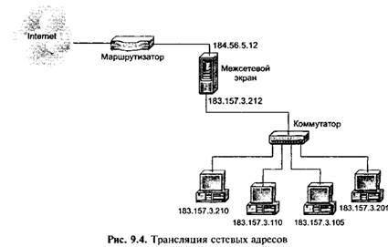 Трансляция сетевых адресов. Для реализации многих атак злоумышленнику необходимо знать адрес своей жертвы. Чтобы скрыть эти адреса, а также топологию всей сети, МЭ выполняют очень важную функцию — трансляцию внутренних сетевых адресов (network address translation) (рис. 9.4).
