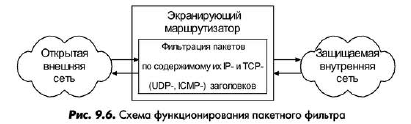Решение о том, пропустить или отбраковать данные, принимается для каждого пакета независимо на основе заданных правил фильтрации. Для принятия решения анализируются заголовки пакетов сетевого и транспортного уровней (рис. 9.6).