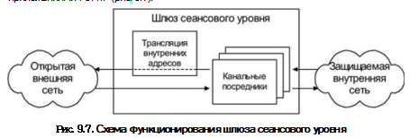 Шлюз сеансового уровня, называемый еще экранирующим транспортом, предназначен для контроля виртуальных соединений и трансляции IP-адресов при взаимодействии с внешней сетью. Он функционирует на сеансовом уровне модели OSI. охватывая в процессе своей работы также транспортный и сетевой уровни эталонной модели. Защитные функции шлюза сеансового уровня относятся к функциям посредничества.