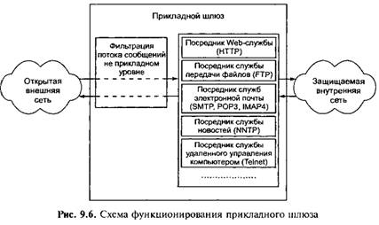 Прикладной шлюз перехватывает с помощью соответствующих экранирующих агентов входящие и исходящие пакеты, копирует и перенаправляет информацию, т. е. функционирует в качестве сервера-посредника, исключая прямые соединения между внутренней и внешней сетью (рис. 9.6).