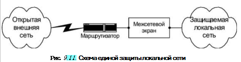 Схема единой защиты локальной сети. Данная схема является наиболее простым решением (рис. 9.11), при котором МЭ целиком экипирует локальную сеть от потенциально враждебной внешней сети. Между маршрутизатором н МЭ имеется только один муть, по которому идет весь трафик. Данный вариант МЭ использует политику безопасности, основанную на принципе «запрещено все, что явно не разрешено»; при этом пользователю недоступны все службы, кроме тех, ятя которых определены соответствующие полномочия. Обычно маршрутизатор настраивается таким образом, что МЭ является единственной видимой снаружи машиной.