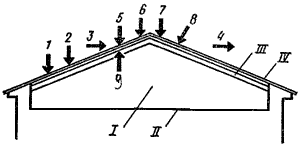I — чердак; II — чердачное перекрытие; III — несущая конструкция; IV — кровля; 1 —постоянные нагрузки (собственный вес); 2 — временные нагрузки (снег, эксплуатационные нагрузки); 3 - ветер (давление); 4 — ветер (отсос); 5 — воздействие температур окружающей среды; 6 — атмосферная влага (осадки, влажность воздуха); 7 — химически агрессивные вещества, содержащиеся в воздухе; 8 — солнечная радиация; 9 —влага, содержащаяся в воздухе чердачного пространства.