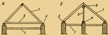 Более целесообразно совместить в одном элементе функции и затяжки, и балки чердачного (междуэтажного) перекрытия. Для этого крышу можно решить в виде стропильной фермы, нижний пояс которой служит балкой перекрытия. Так же можно поступать и в случае создания мансардного этажа.