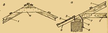 Стропильные ноги выполняют из досок сечением 50 х 150 и 50 х 200 мм. Шаг дощатых стропил принимается 70—100 см. Большее сечение и меньший шаг стропильных ног нужно принимать при пролетах более 4 м, малом угле наклона кровли (до 40), в районах с большими снегопадами.